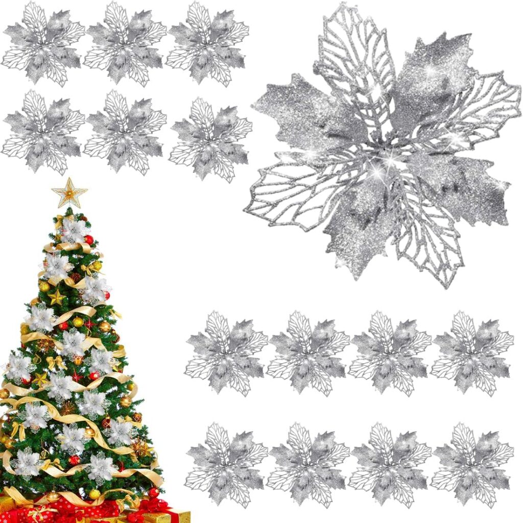 Poinsettia Purpurina Adorno de Árbol de Navidad, Flores de Brillo Navideño, Flores Artificiales Navidad, Flores Navideñas para el Arbol de Navidad, para Decoraciones Árbol Navidad, Plata
